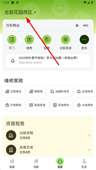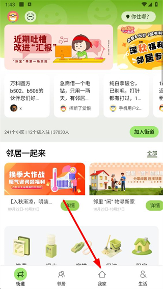 1、在住這兒app首頁(yè)點(diǎn)擊我家選項(xiàng),進(jìn)入房屋管理頁(yè)面。