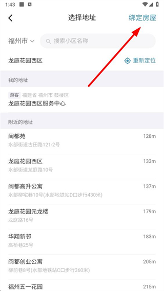 3、在選擇地址頁(yè)面點(diǎn)擊綁定房屋選項(xiàng),進(jìn)入我的房屋頁(yè)面。