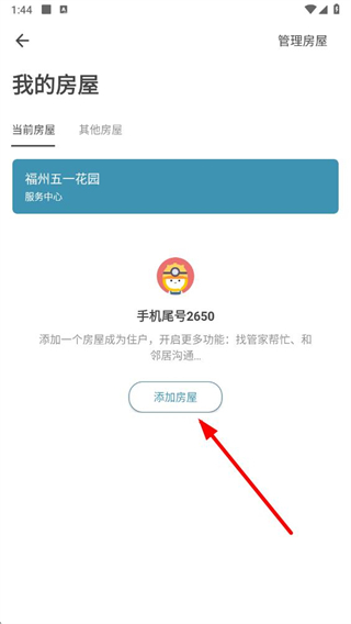 4、在我的房屋頁(yè)面點(diǎn)擊添加房屋按鈕,按提示完成房屋綁定操作。