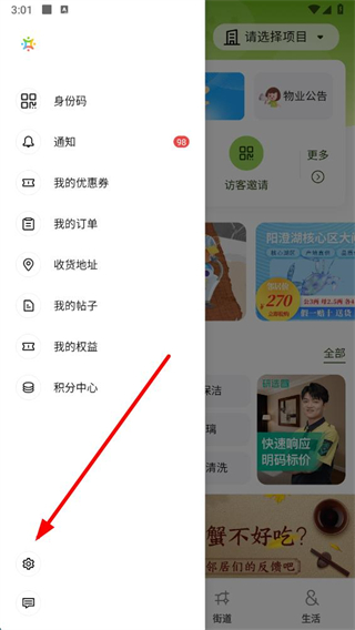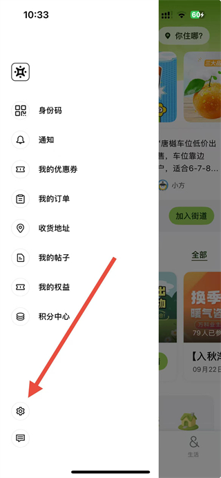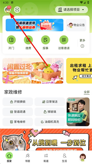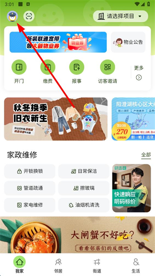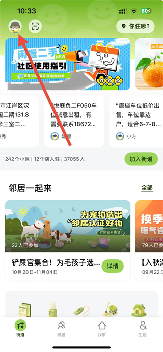 1、在住這兒app的我家頁(yè)面左上角,點(diǎn)擊頭像圖標(biāo),展開側(cè)邊功能菜單列表。