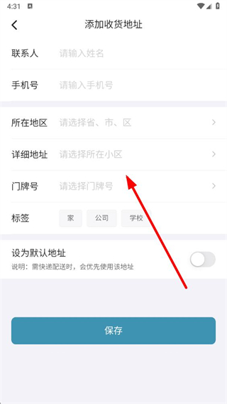 4、在添加收貨地址頁(yè)面,依次填寫聯(lián)系人、手機(jī)號(hào)、所在地區(qū)等信息,完成后點(diǎn)擊保存即可添加地址。