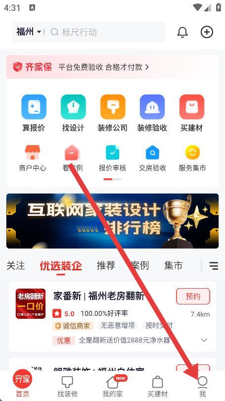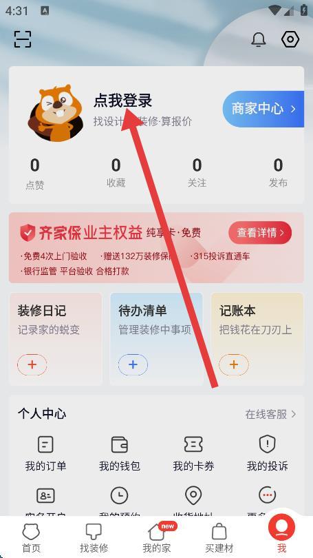 1、打開齊家裝修網(wǎng),點(diǎn)擊底部導(dǎo)航欄右下角的我選項(xiàng)。