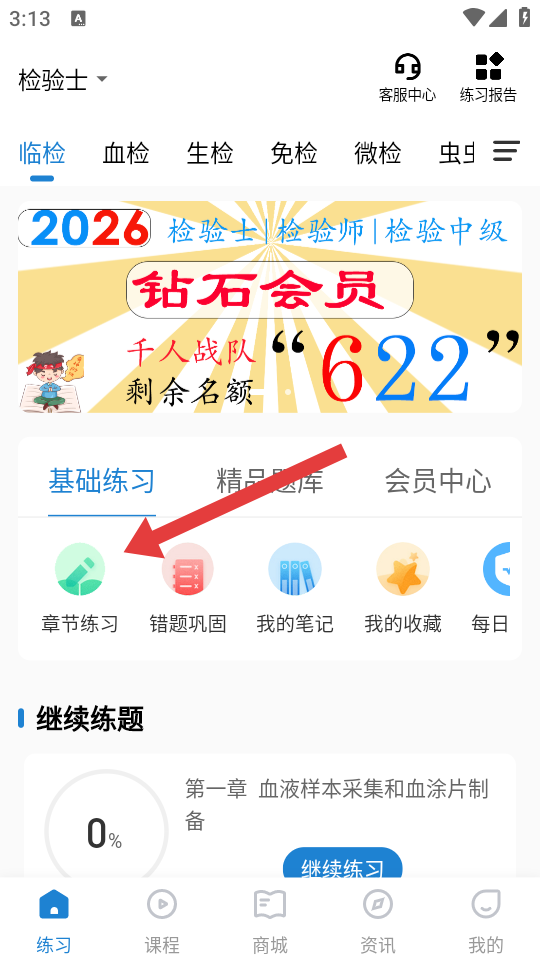 1、在練習的頁面,需要點擊章節(jié)練習的按鈕,進入章節(jié)練習列表。