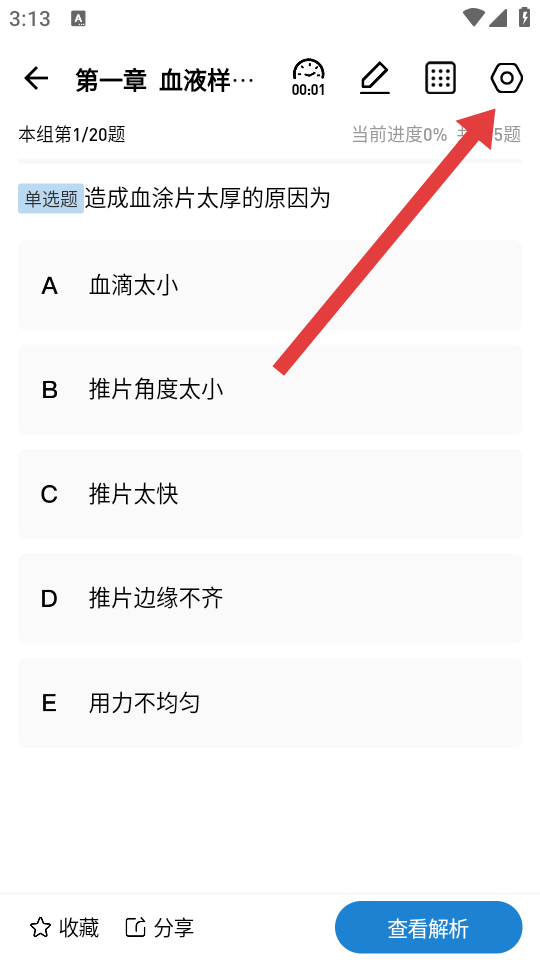 3、在章節(jié)練習題目界面,點擊右上角設置圖標,調(diào)出設置選項。
