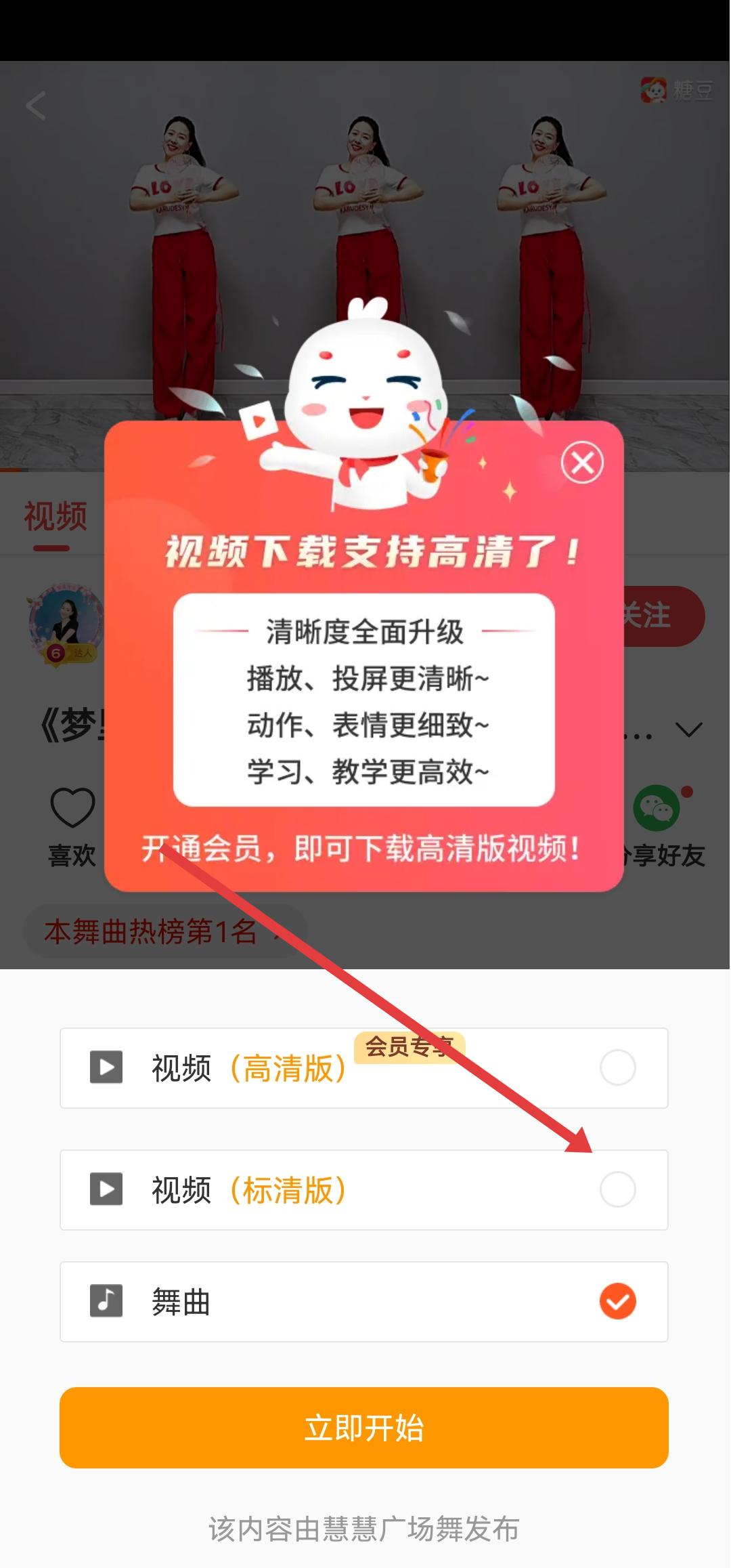 3、在下載窗口中,選擇所需清晰度如視頻標(biāo)清版,點擊立即開始,即可下載該廣場舞的視頻。
