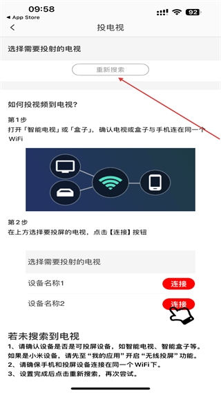 3、進入到投電視的界面內(nèi),點擊重新搜索的按鈕即可。