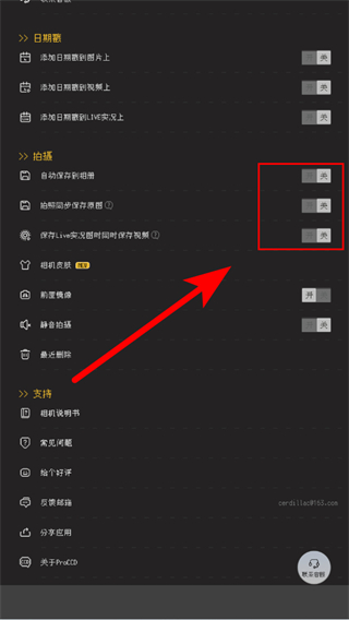 3、在拍攝設(shè)置中,將自動保存到相冊的開關(guān)開啟。