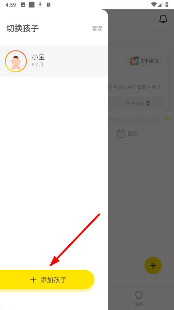 2、在展開的頁面中找到并點擊添加孩子的黃色按鈕,進(jìn)入添加界面。