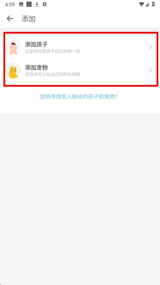 3、在添加頁面會看到添加孩子選項,點擊它即可開始錄入第二個孩子的相關(guān)信息,若家中有寵物也可點擊添加寵物為寵物創(chuàng)建時光相冊。
