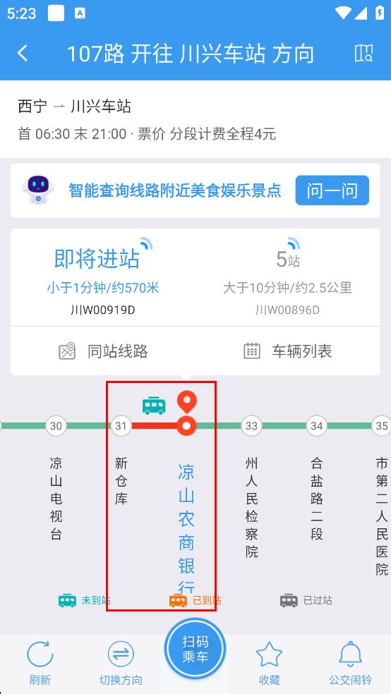 2、在公交詳細信息頁面,查看線路的首末班車時間、票價等基本信息,以及公交當前的位置和距離本站的站點數(shù)、預計時間等實時動態(tài)。