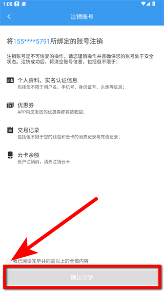 4、勾選同意后,點擊確認注銷按鈕,即可完成月城公交app賬號注銷。