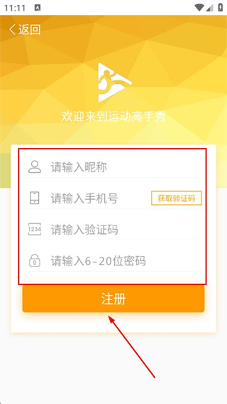 1、打開運動高手秀APP,在注冊/登錄頁面,點擊立即注冊。