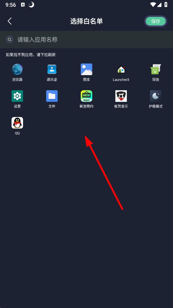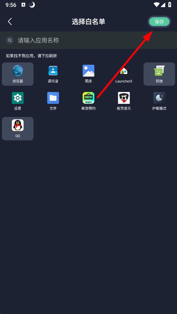 4、選擇好要添加的應(yīng)用后,點擊界面右上角的保存按鈕,完成白名單添加設(shè)置。