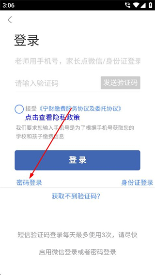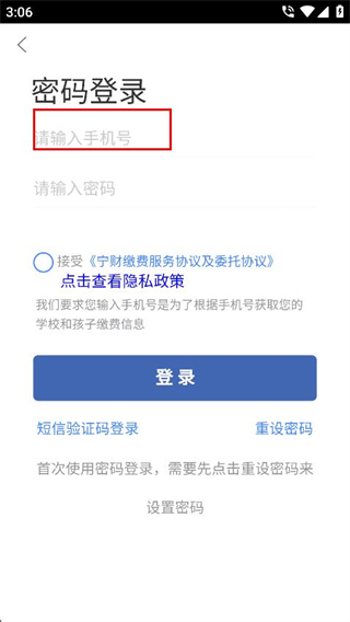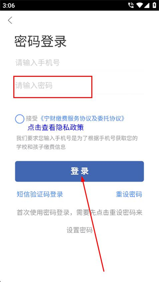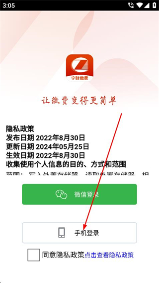 1、打開(kāi)寧財(cái)繳費(fèi)app,找到并點(diǎn)擊手機(jī)登錄。