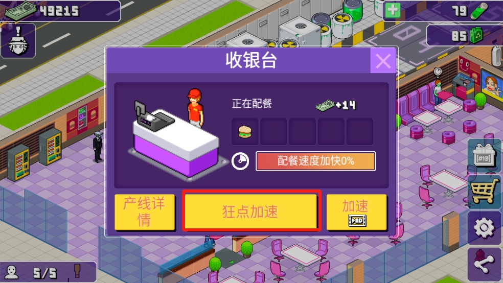 2、在配餐的速度上我們可以通過選擇狂點加速,增加配餐的速度讓更多的人可以享受到美食;