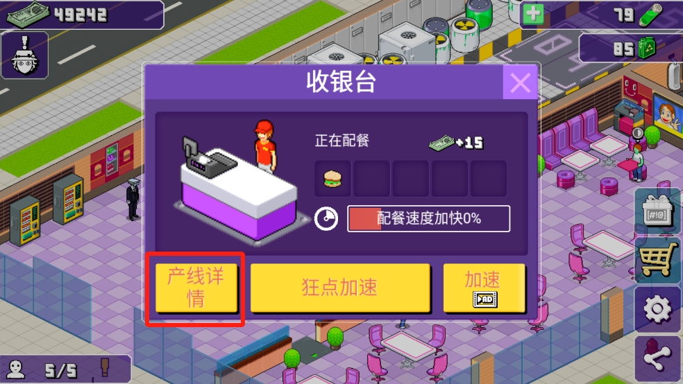 -餐廳有個7個等級,最多8條生產(chǎn)線。等級越高,餐廳面積越大,人口上限也能提升哦