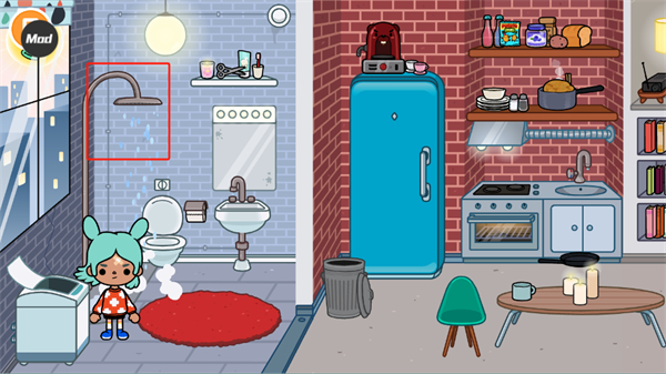 3、只需要將你的角色拖動到浴室淋浴頭下方,并點擊淋浴頭的位置,玩家即可以給自己的角色洗澡;