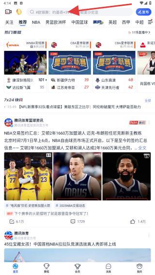 1、打開騰訊體育APP,點(diǎn)擊首頁(yè)頂部搜索欄,喚起搜索輸入框。