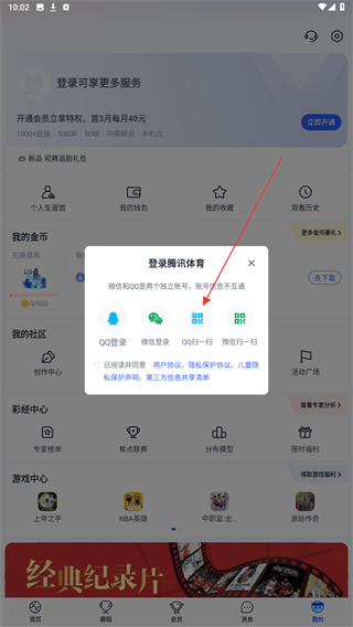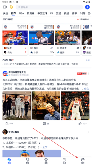 1、打開騰訊體育APP,點(diǎn)擊右下角我的選項(xiàng)。