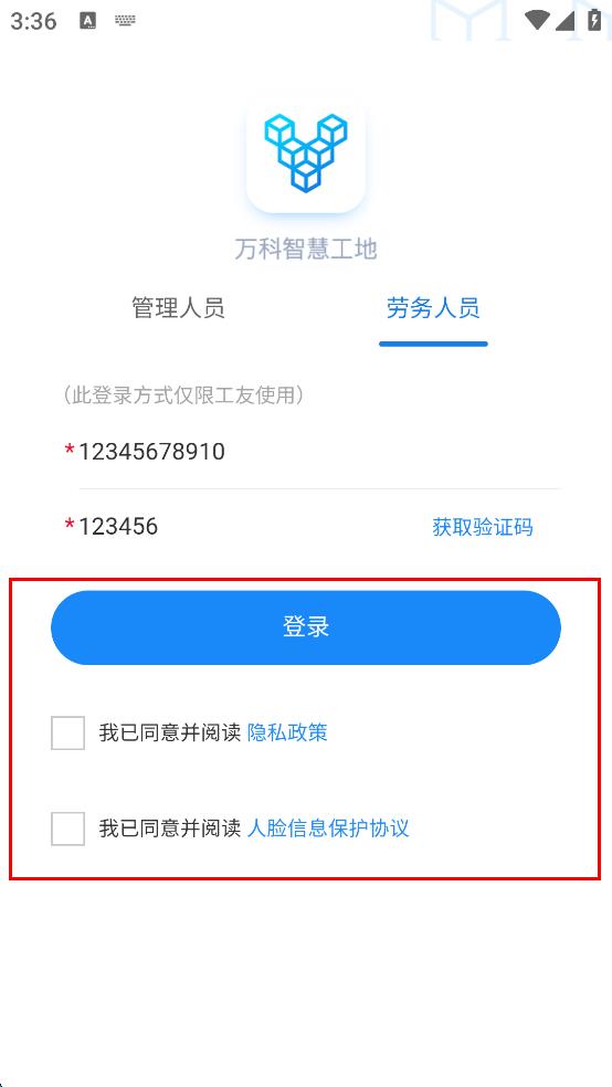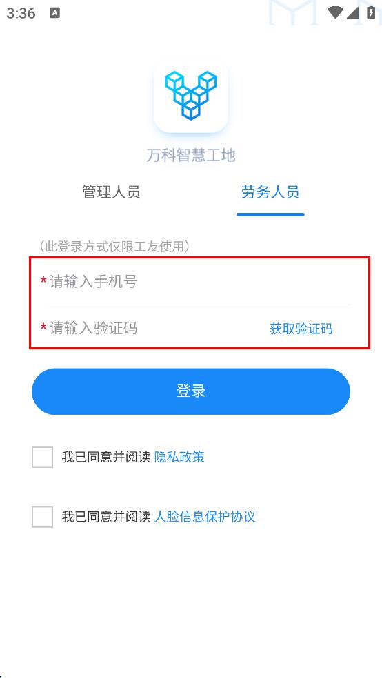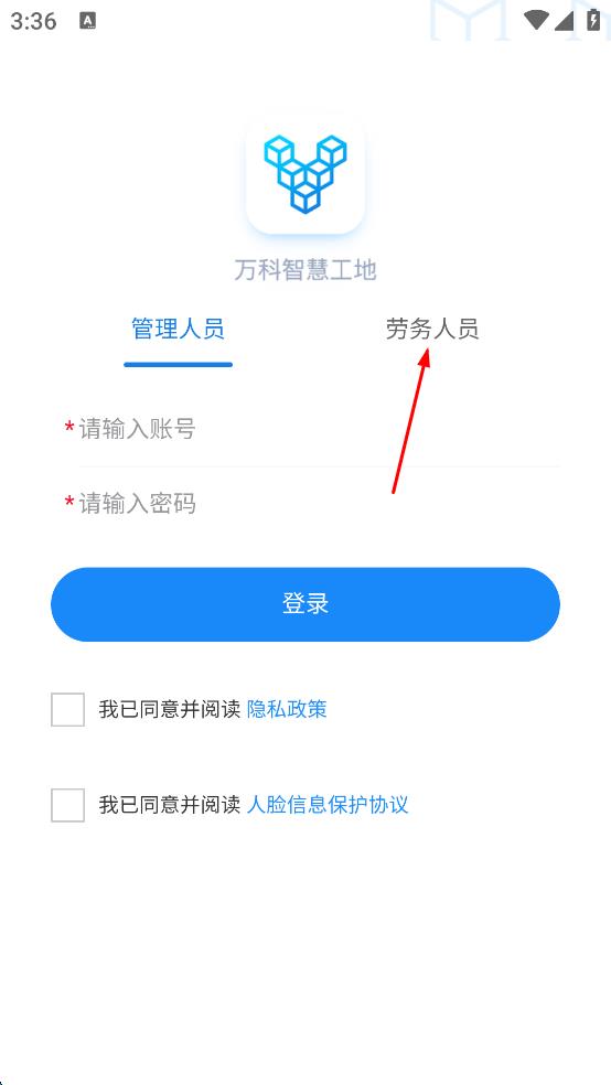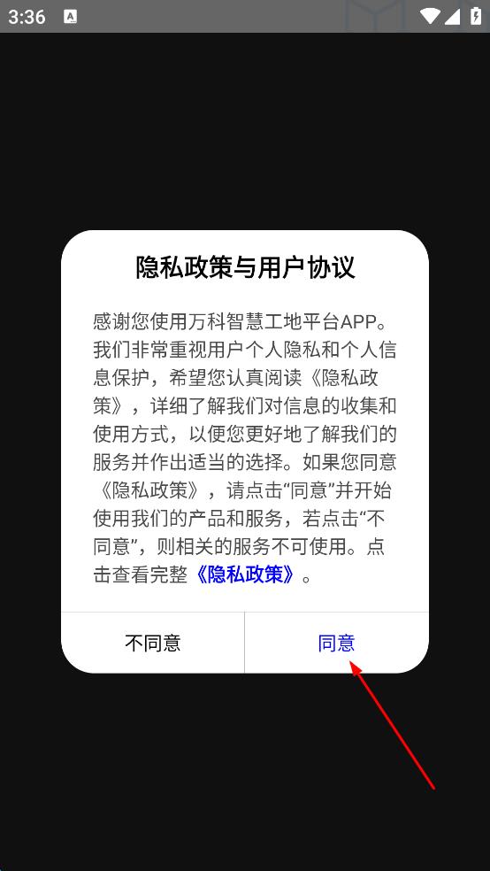 1、打開萬科智慧工地平臺(tái)APP,出現(xiàn)隱私政策與用戶協(xié)議提示框,點(diǎn)擊同意。