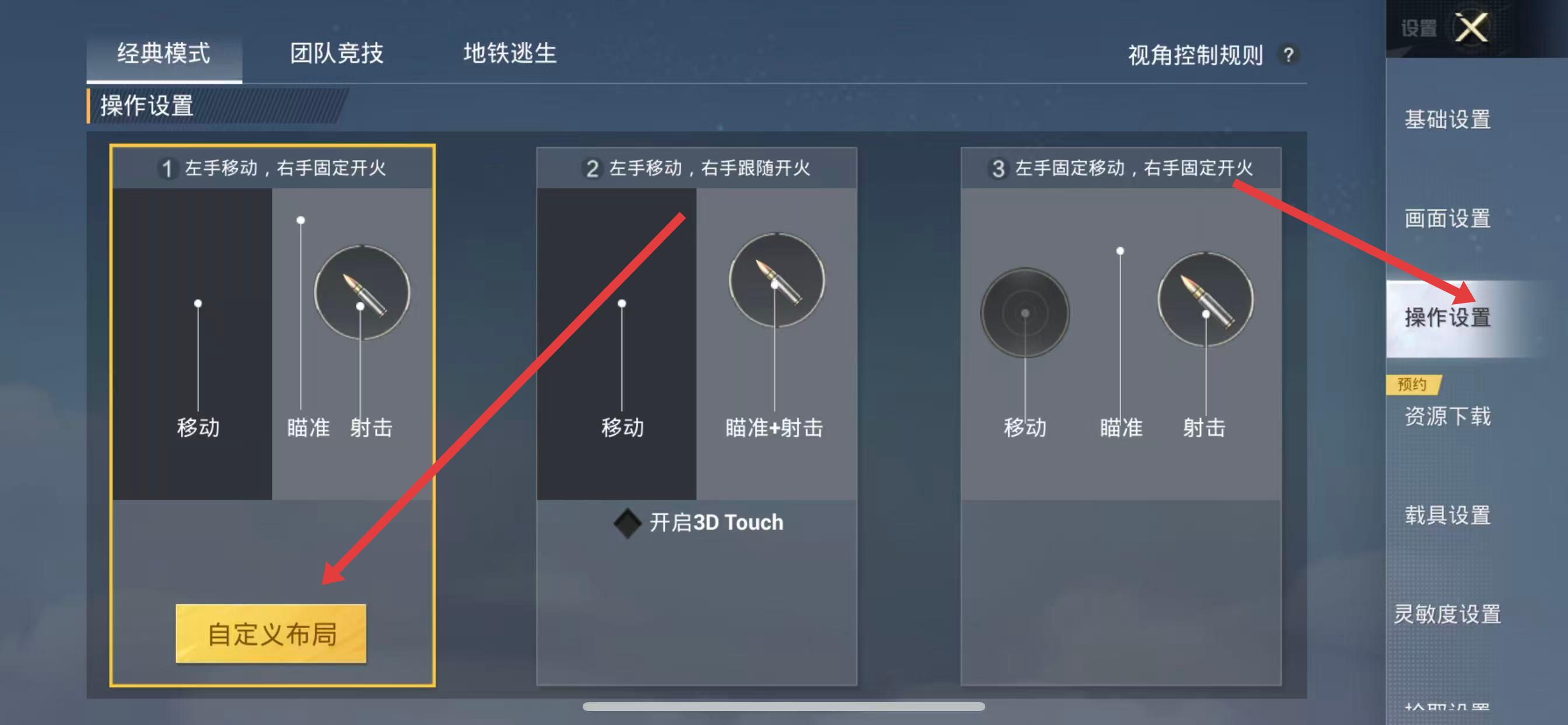 3、在操作設(shè)置頁面中,選擇一種基礎(chǔ)操作布局,然后點(diǎn)擊下方的自定義布局按鈕。