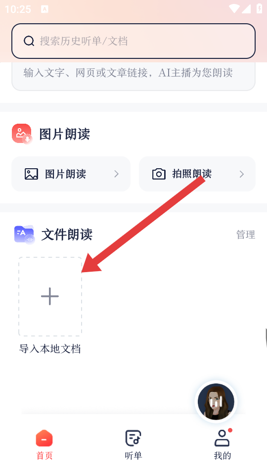 1、打開訊飛有聲APP,進入主界面后,點擊導入本地文檔按鈕,進入本地文件導入界面。