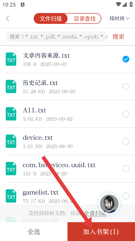 2、在本地文件導入界面,軟件會自動檢索手機中的文件,勾選想要導入的文件,點擊底部加入書架。