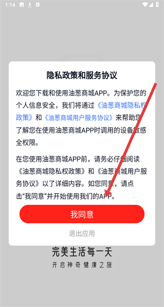 1、點(diǎn)擊“隱私政策和服務(wù)協(xié)議”彈窗的“我同意”,進(jìn)入油蔥商城APP主界面。
