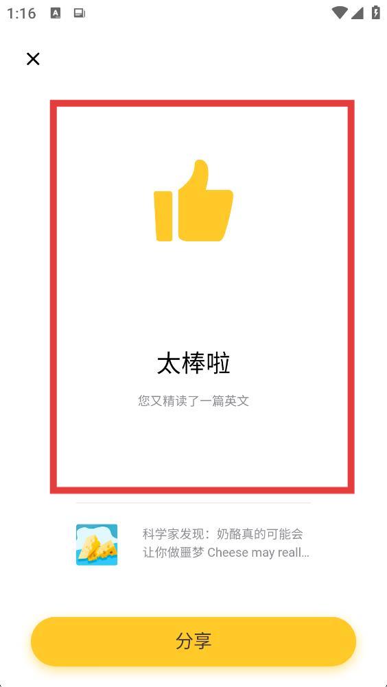 4、彈出提示界面,顯示又精讀了一篇英文,即完成當(dāng)日打卡。