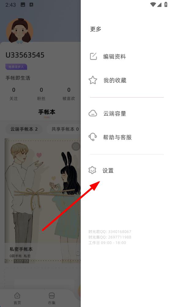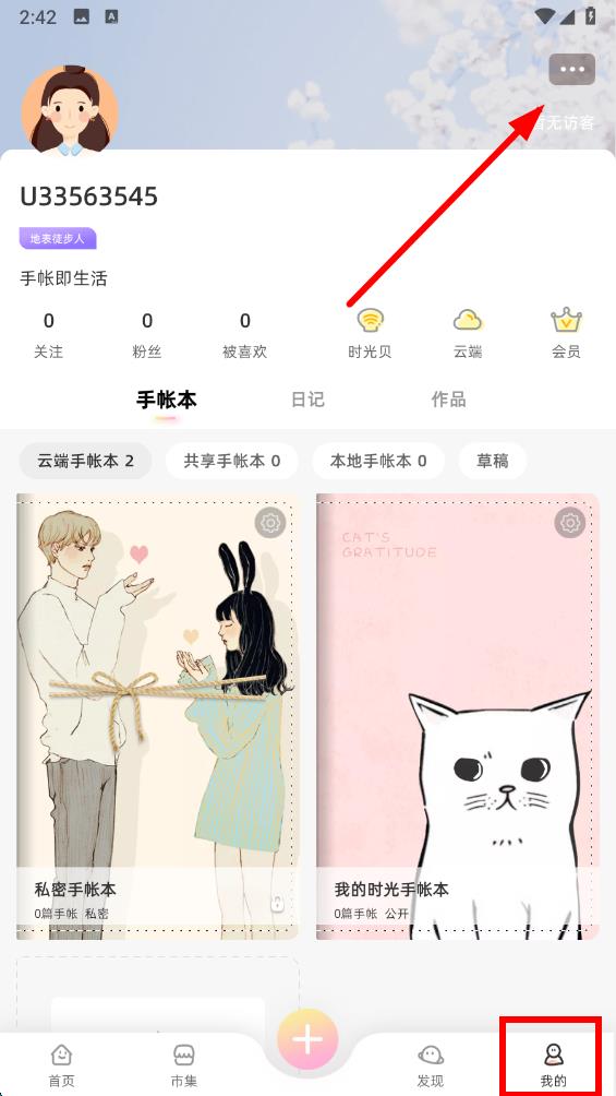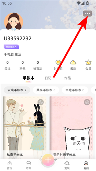 1、打開時(shí)光手帳APP,點(diǎn)擊底部導(dǎo)航欄中我的選項(xiàng),進(jìn)入個(gè)人頁面后點(diǎn)擊頁面右上角的菜單圖標(biāo)。