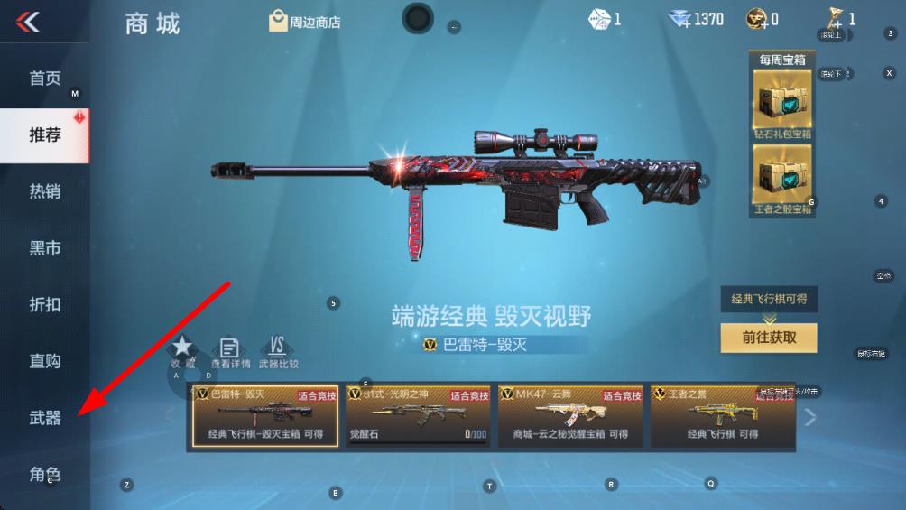 2、進(jìn)入商城后,在商城主界面點(diǎn)擊左側(cè)菜單欄中的武器選項(xiàng)。
