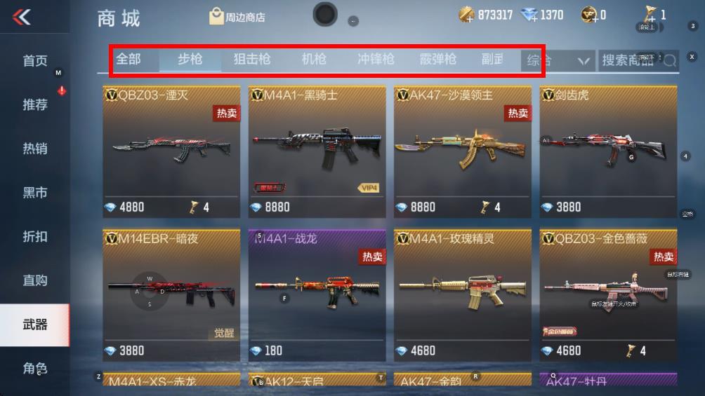 3、在武器展示頁面,上方有多項(xiàng)武器分類標(biāo)簽如步槍、狙擊槍等,根據(jù)需求選擇。