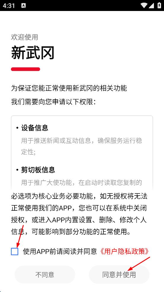 1、打開新武岡APP,彈出權(quán)限申請及用戶隱私政策提示框,勾選使用APP前請閱讀并同意用戶隱私政策,點擊“同意并使用”按鈕,進入APP體驗界面。