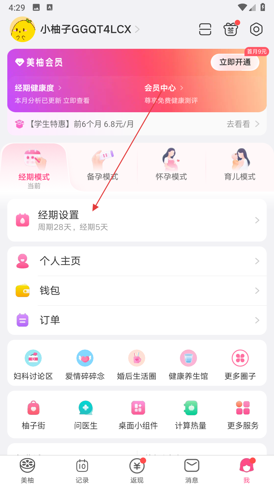 2、在個人頁面中,點擊經期設置選項,進入經期設置界面。
