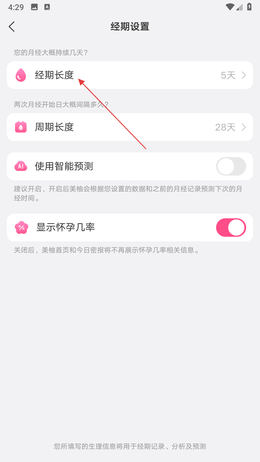 3、在經期設置界面,點擊經期長度,彈出選擇經期天數的選項列表。