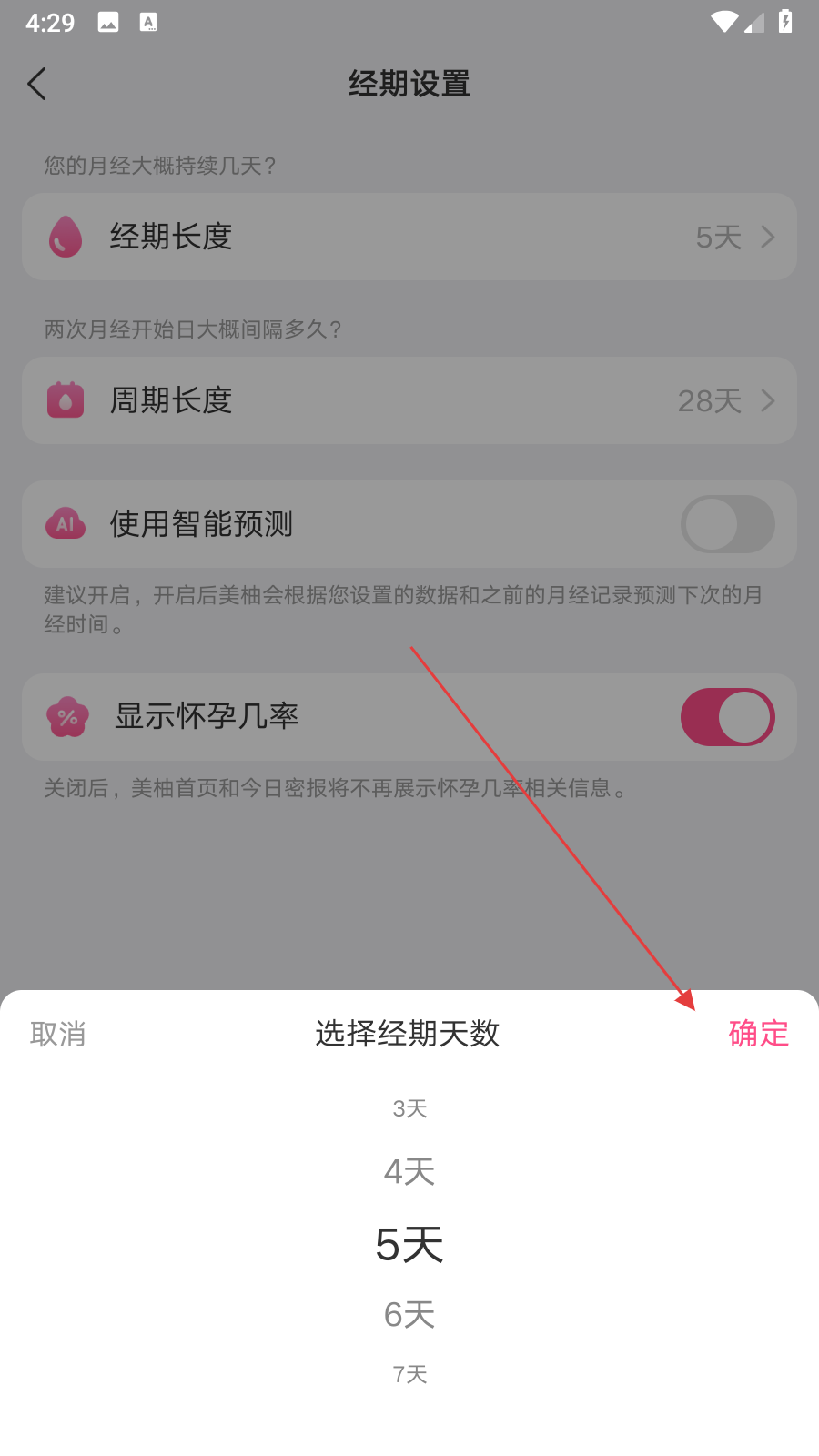 4、在列表中選擇合適的經期天數,選擇完成后點擊確定,即可完成經期天數的設置。