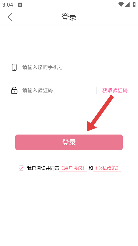 4、在登錄界面輸入手機(jī)號(hào)、驗(yàn)證碼,勾選用戶協(xié)議和隱私政策后,點(diǎn)擊登錄按鈕完成登錄。