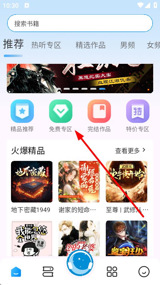 1、打開月亮聽書APP,在首頁點擊免費專區(qū)選項進入免費書籍界面。