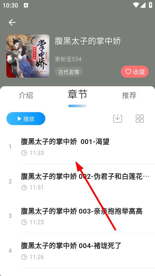 4、在章節(jié)列表里,點擊想收聽的章節(jié),如腹黑太子的掌中嬌001-渴望,即可免費收聽該章節(jié)內(nèi)容。