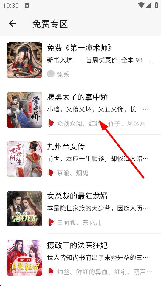 2、在免費專區(qū)中,選擇想聽的書籍,比如腹黑太子的掌中嬌,點擊進入書籍詳情頁。