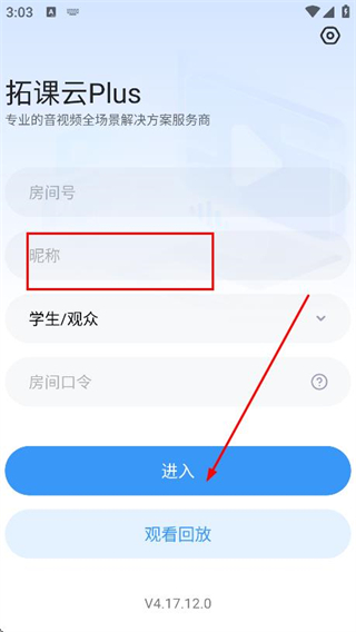 2.教室號和教室密碼將由授課老師在班級群內(nèi)統(tǒng)一通知,身份選擇學生,昵稱填寫學生姓名;