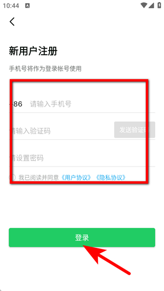 4、輸入信息,勾選同意相關(guān)協(xié)議后點(diǎn)擊登錄按鈕,即可完成賬號(hào)注冊(cè)操作。
