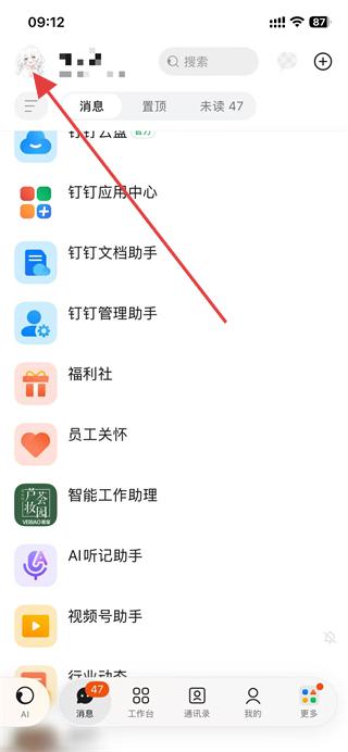 1、打開(kāi)釘釘,在主頁(yè)面,找到并點(diǎn)擊左上角的頭像。