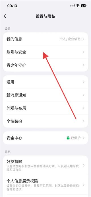 3、進(jìn)入設(shè)置頁(yè)面后,找到并點(diǎn)擊賬號(hào)與安全選項(xiàng)。