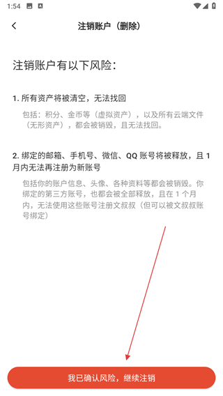 3、在注銷賬戶風險提示頁面,確認后點擊我已確認風險,繼續(xù)注銷按鈕。