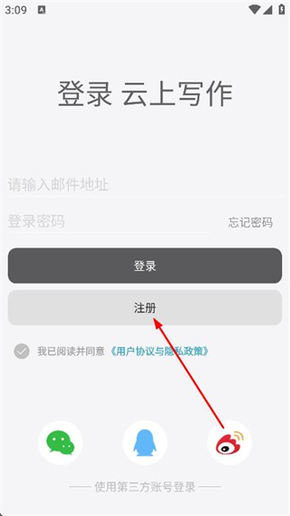 1、打開云上寫作,在登錄頁面點擊注冊按鈕。