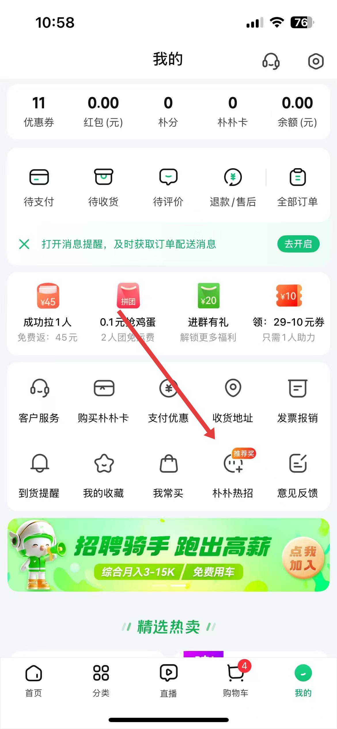 1、打開樸樸超市app點(diǎn)擊底部導(dǎo)航欄的我的選項(xiàng),進(jìn)入個(gè)人頁面,在頁面中找到樸樸熱招選項(xiàng),點(diǎn)擊該選項(xiàng)進(jìn)入樸樸招聘界面。