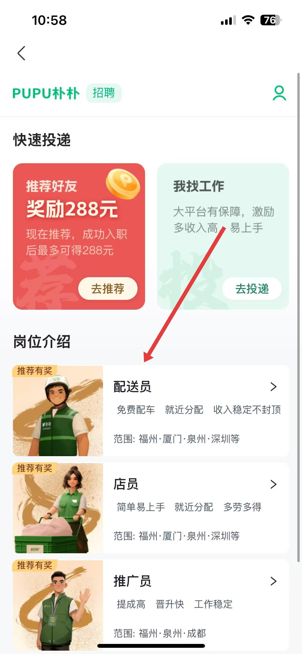 2、進(jìn)入樸樸招聘界面后,在我找工作板塊下,能看到各種崗位,點(diǎn)擊配送員選項(xiàng),進(jìn)入配送員崗位詳情頁面。