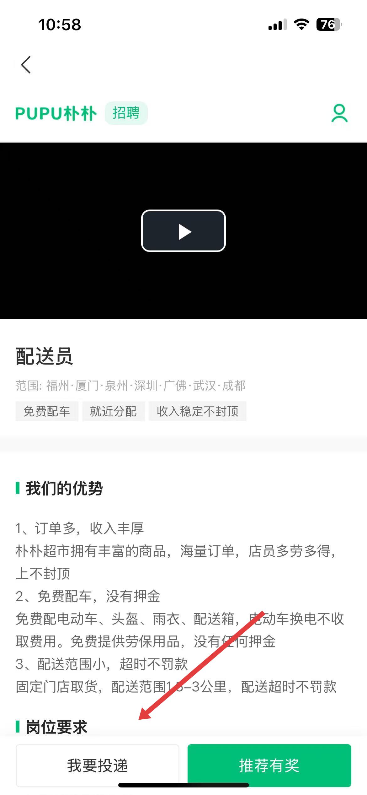 3、在配送員崗位詳情頁面,確認(rèn)符合條件且有意應(yīng)聘后,點(diǎn)擊頁面下方的我要投遞按鈕,按照后續(xù)提示填寫個(gè)人信息、提交簡(jiǎn)歷等,完成配送員注冊(cè)申請(qǐng)。