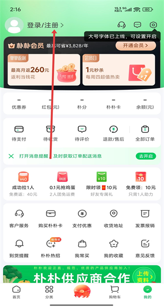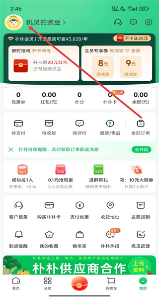 1、可以在樸樸超市首頁中,點(diǎn)擊我的按鈕,進(jìn)入個(gè)人中心頁面。
